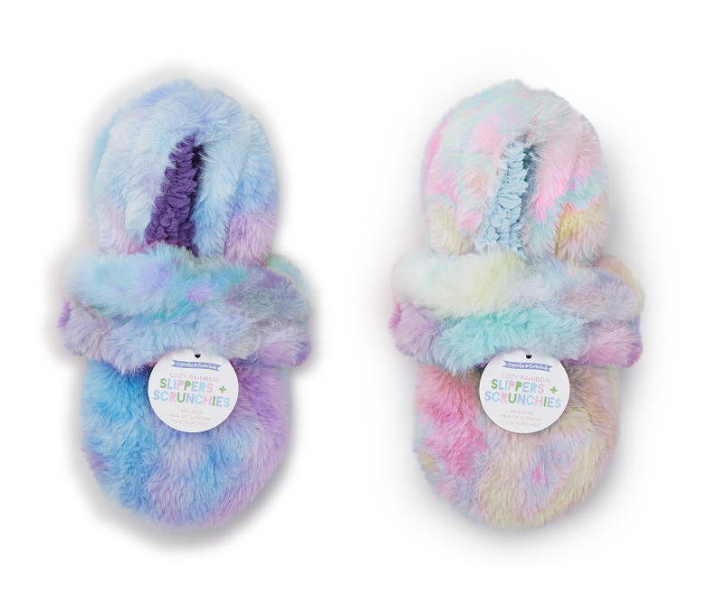 Fuzzy Tie Dye Rainbow Slippers And Scrunchie Set