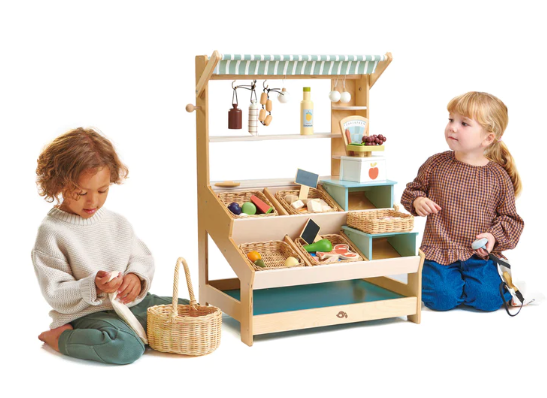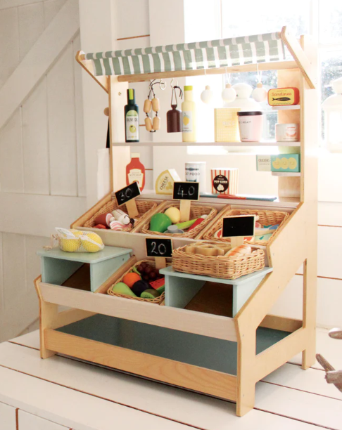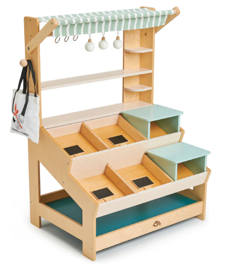 A magnificent market stall with shelves and 2 inter-changeable mini platforms so that it can be adapted to any kind of store. A pretty striped canopy can be lowered to protect your fresh produce from the beaming sun, and at night we have 3 cute light bulbs, metal hooks to hang your fruit and four blackboard price markers. This set also includes a pretty printed tote bag.