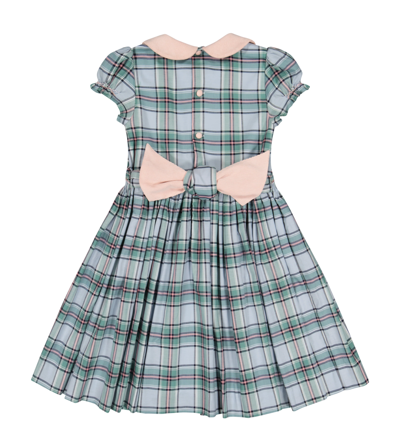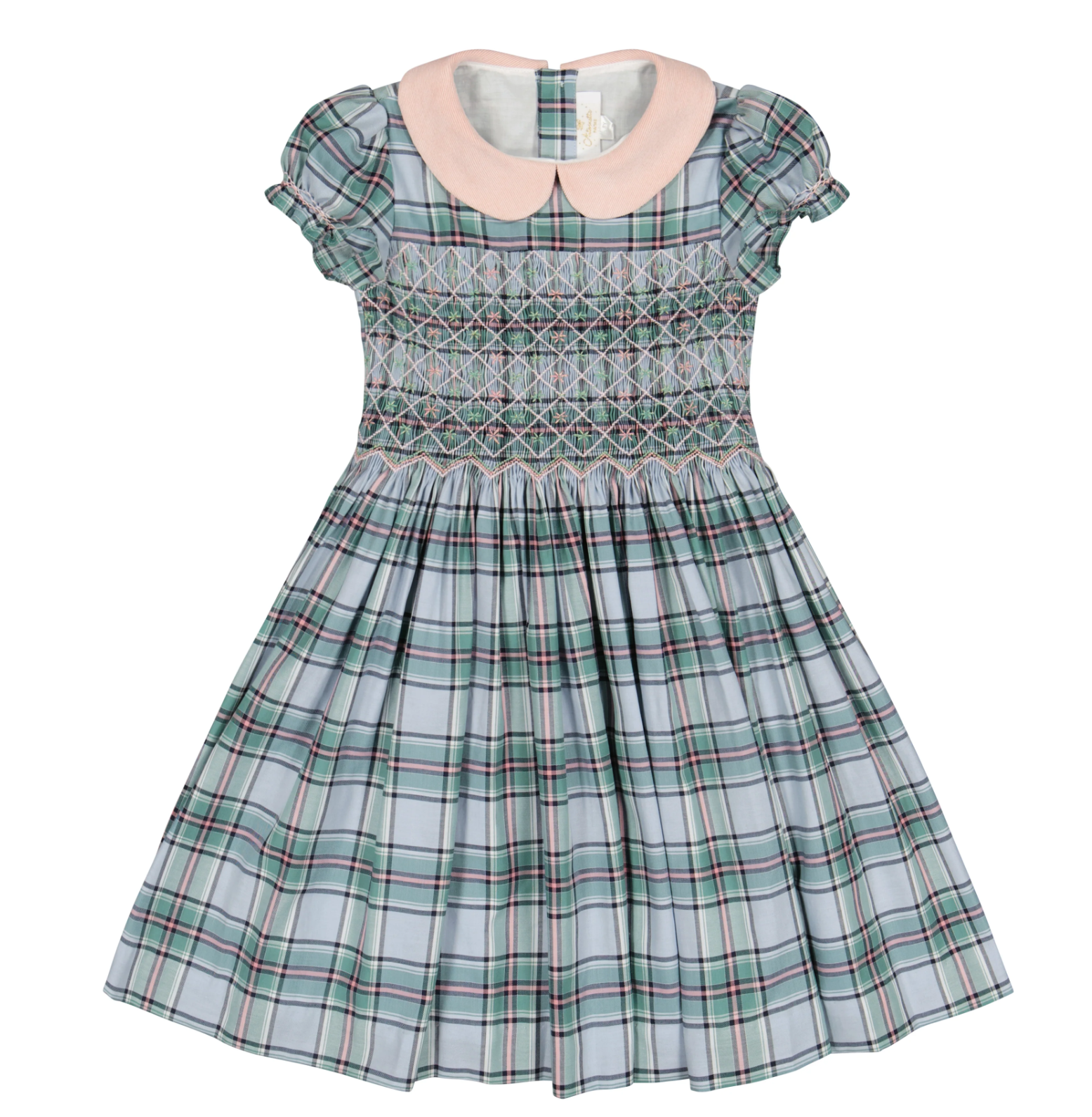 Sherazade Short Sleeve Smocked Dress - Green/Pink Tartan