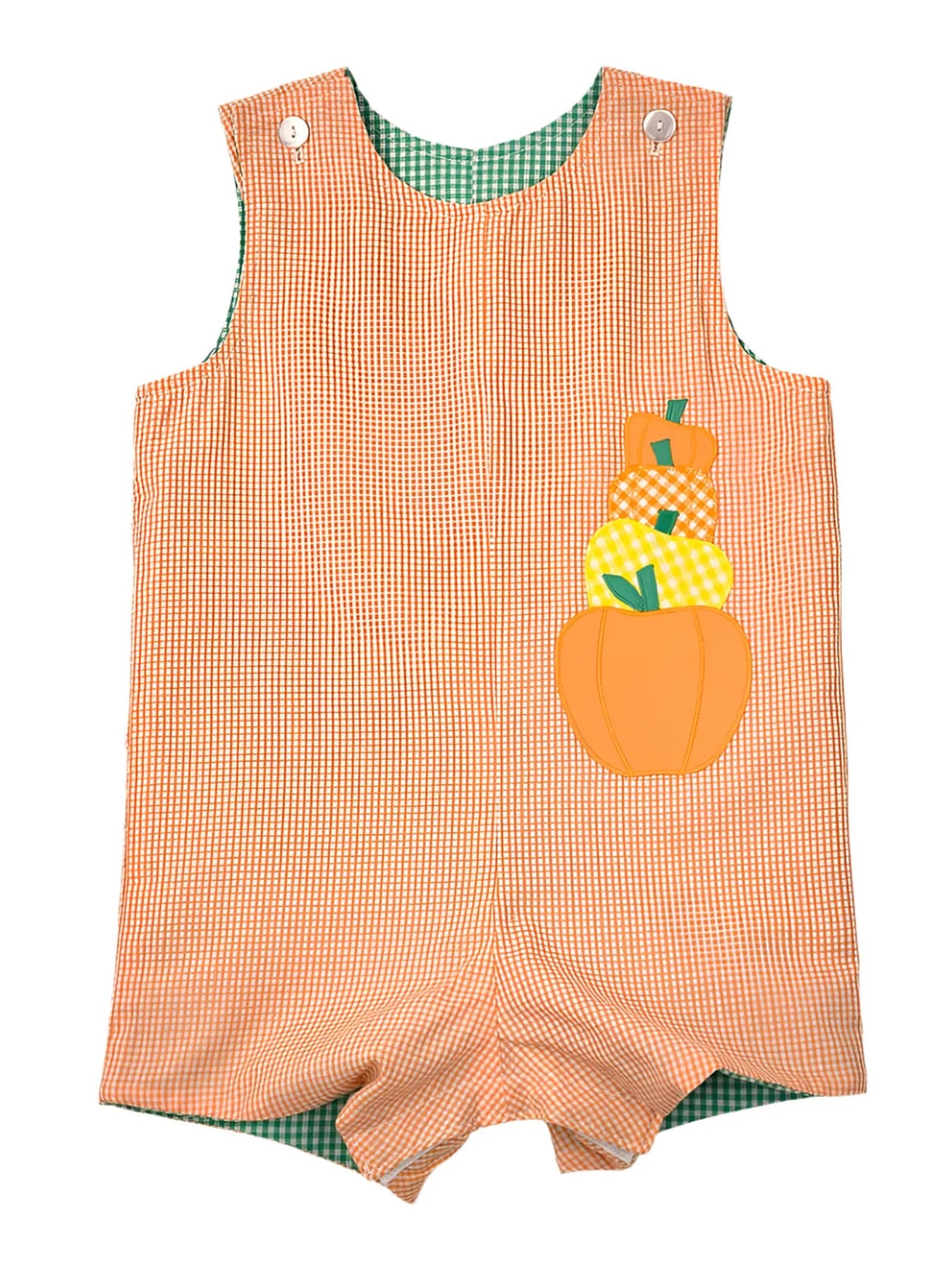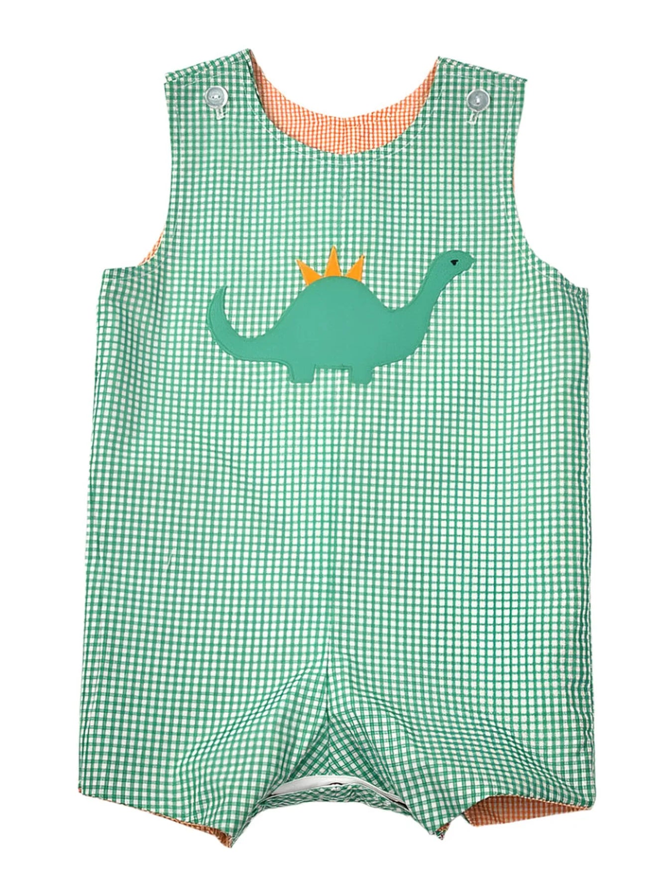 Orange Gingham Reversible Shortall With Pumpkins and Dino
