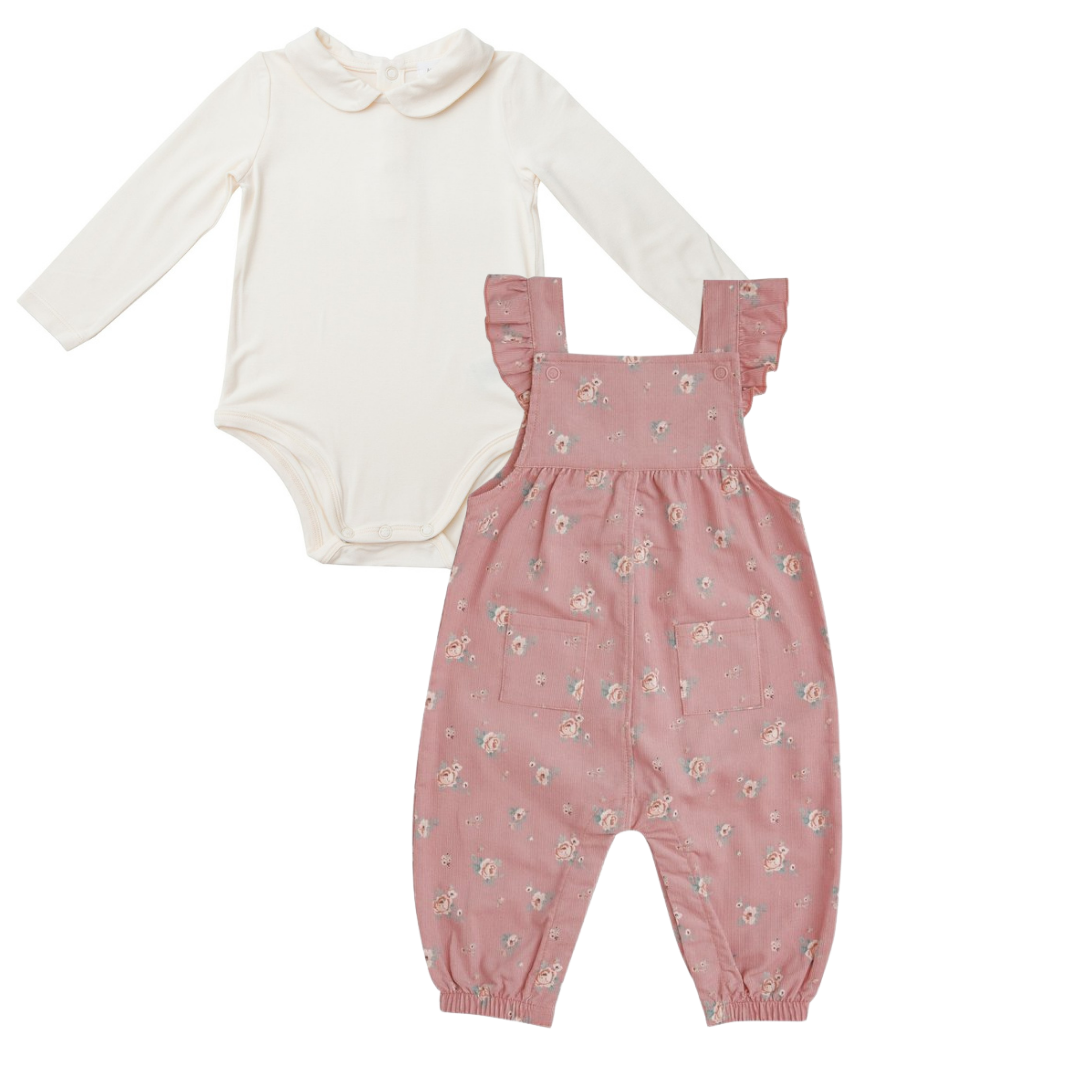Mini Rose Corduroy Ruffle Overalls With Peter Pan Collar Bodysuit