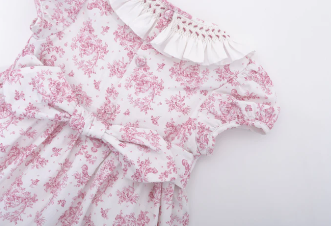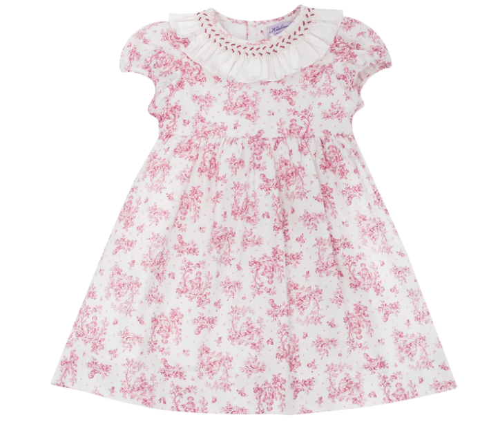 Red Toile Thais Short Sleeved Dress With Smocked Collar