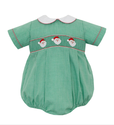 Green Gingham Short Sleeve Bubble With Santa Face Smocking