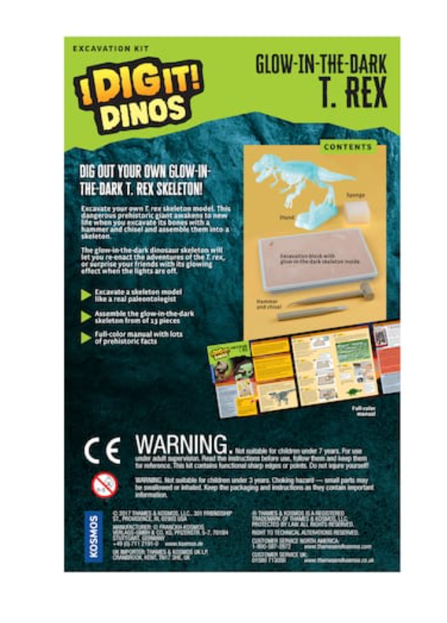 Excavate your own glow-in-the-dark Tyrannosaurus rex skeleton model. This dangerous prehistoric giant comes to life when you excavate its bones with a hammer and chisel and assemble them into a skeleton. The skeleton lets you reenact prehistoric adventures or surprise your friends with its glowing effect when the lights are off.