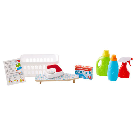 Kids will have loads of fun playing house with this these realistic laundry accessories! The 14-piece set includes a sturdy take-along basket to hold all the supplies and a reusable activity card to check off chores. Kids three and older will love spraying, measuring, and pressing with a stain remover spray bottle that can be filled with water, detergent and fabric softener bottles with removable lids, a box of three pretend dryer sheets, and a wooden iron and ironing board. Laundry day has never been such fun!