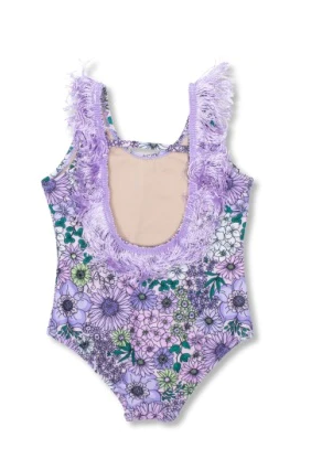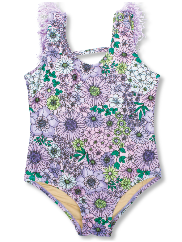 Mod Purple Floral Fringe Back Girls One Piece Swimsuit