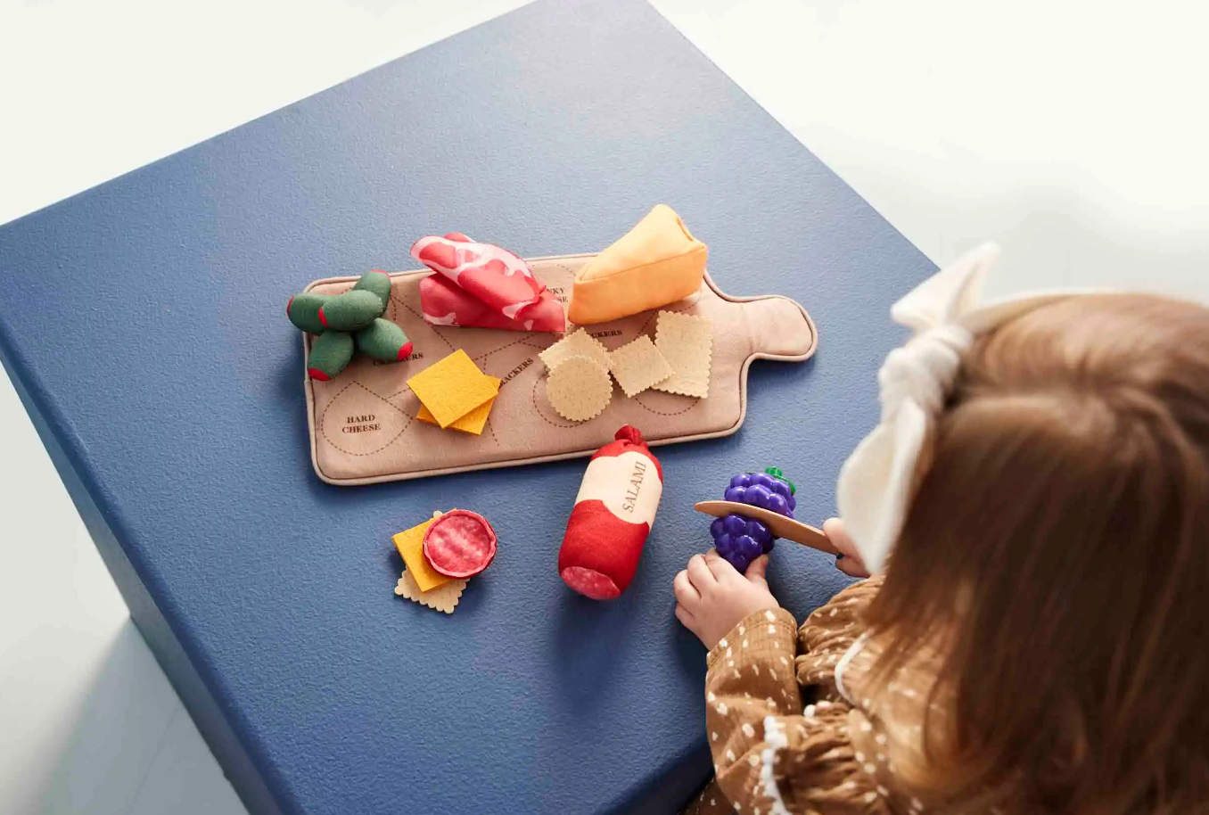 Cheese and Crackers are fun for every age with our Charcuterie Board Play Set. The eighteen-piece set comes with a play charcuterie board, for refined little cuties! The charcuterie board comes with 6 felt crackers, felt olive bunch, plush cheese, grapes, plush salami, wood knife, 3 felt slices of cheese and 2 pieces of prosciutto. This tool set is intended for ages 3 and up.
