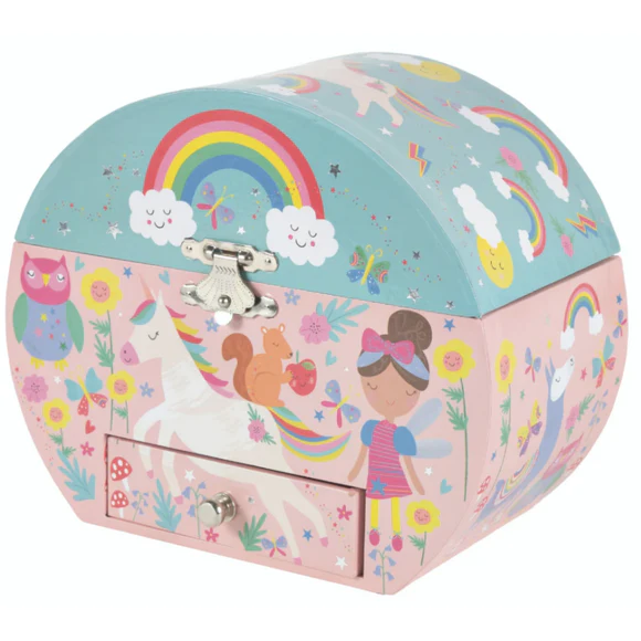Our musical jewellery boxes are so sweet and are one of our best-selling products! The Rainbow Fairy Circular Jewellery Box is covered with gorgeous illustrations of fairies, unicorns, rainbows and more. The handy drawer is perfect for storing treasured trinkets. Wind the key up at the back, then lift the lid to see a magical unicorn twirl around to the tune of ‘you are my sunshine’