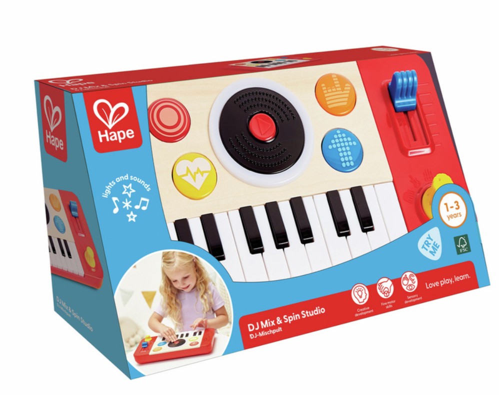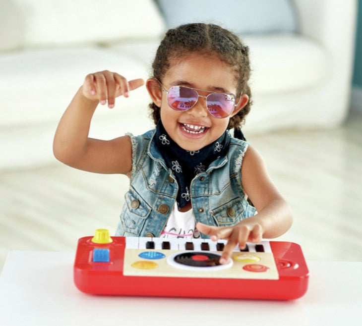 The versatile DJ Mix & Spin Studio develops musical learning at different ages. Toddlers can discover the joy of music at the touch of a button, but as they grow they can start learning to play the keyboard and discover how to mix tracks. The keyboard has four instrument sounds (piano, bass, organ and drum), and it comes with a music booklet with eight different songs, as well as musical alphabet stickers to put on the piano keys to help children learn the songs. The DJ Mix & Spin Studio will last for years and accompany your child’s growth and musical journey.
