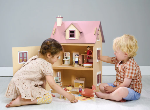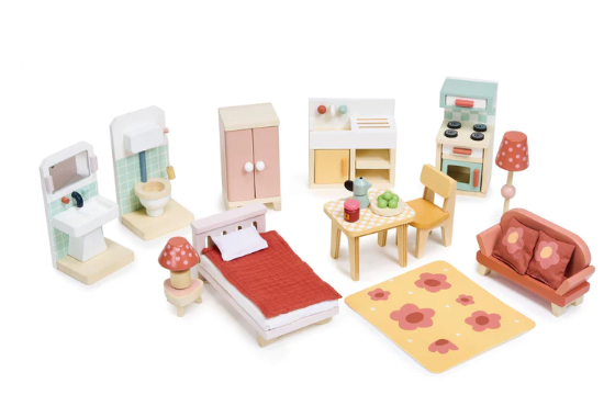 Foxtail Villa is the perfect town-style dolls house. The subtle colors and top-quality FSC plywood fascia make this a beautiful mid-size dolls house for any little boy or girl, with a clever design to lift and hold the roof to access the attic. Included is a starter set of matching furniture: A cooker, sink unit, table and chair, coffee pot, jam pot, bowl of apples, sofa with printed cushions, floor mat, side table, tabletop lamp, standard lamp, pillow, bed with coverlet, wardrobe, retro style toilet and bathroom sink unit.