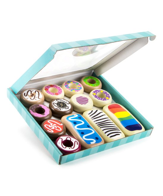 Cream-center, jelly-filled, glazed and sprinkly, a belly-full of playtime laughs for little ones is sure in store with this wooden 13-donut set that takes their imagination out of the box.