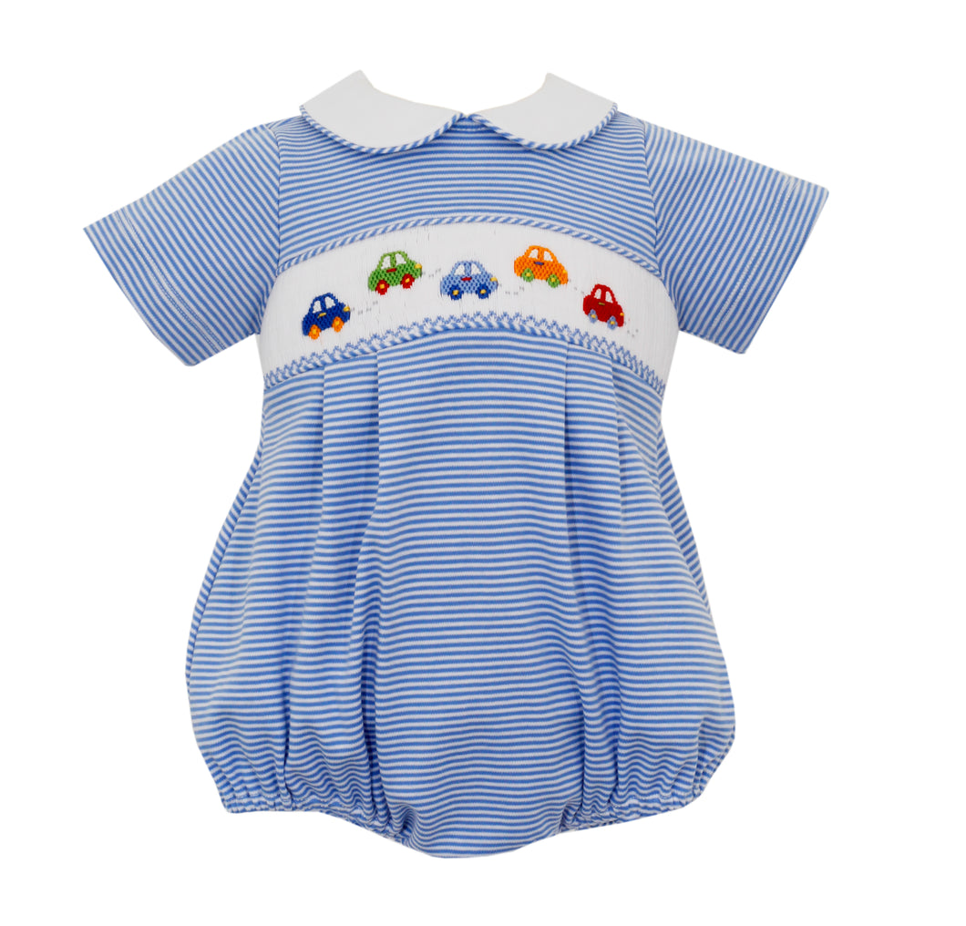 Periwinkle Blue Stripe Knit Bubble With Cars Smocking