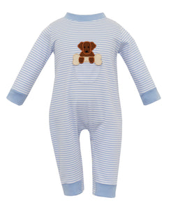 Blue Stripe Knit Long Romper With Puppy Applique