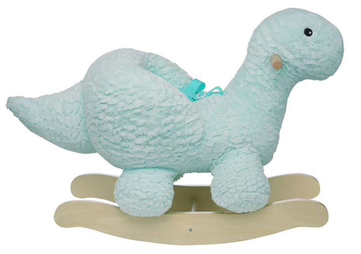 The Rock 'n Roary dinosaur rocker is perfectly plush and ready for young toddlers. It features a soft fabric padded design, wood handles, a contoured backrest with an adjustable seat-belt. Little ones can feel safe and secure with every rock. A chime in the dino tail adds whimsical fun to rocking play-time. Encourages motor development and cause and effect learning.