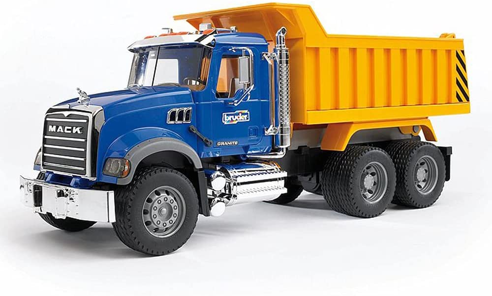 The MACK Granite Dump Truck by Bruder offers children realistic and active fun. This highly detailed truck features a realistic driver's cabin with doors that open, adjustable side-view mirrors, a tilting engine hood which provides a full view of the engine block, and many other features which give these trucks their beautiful chrome look. Like a real dump truck, the open-box bed lifts at the front and tilts allowing the content within to be deposited.